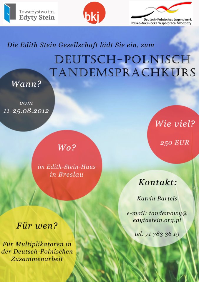 Die Edith Stein Gesellschaft teilt mit, dass die Bewerbung für die Sommerausgabe des Deutsch-Polnischen Intensiv-Tandem-Sprachkurses ab jetzt möglich ist. Diesmal wird er vom 11. - 25 August 2012 im Edith-Stein-Haus in Breslau stattfinden.