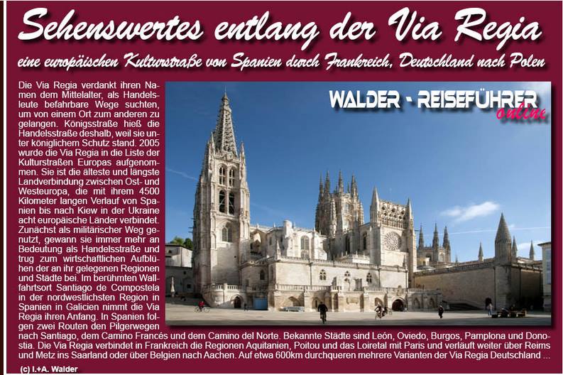 Walder-Verlag (Kreuztal) zunächst eine Online-Ausgabe seiner neuesten Publikation „Sehenswertes an der VIA REGIA“ veröffentlicht, die auch im Druck erscheinen soll. Die Herausgeber stellen den Streckenabschnitt von Santiago de Compostela bis Görlitz mit vielen attraktiven Fotos und kurzen Texten über 56 ausgewählte Orte dar.